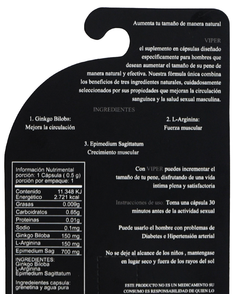 VIPER es un suplemento diseñado para potenciar el desempeño sexual masculino de forma natural. Una cápsula 30 minutos antes de la actividad proporciona apoyo discreto y efectivo. Ideal para quienes buscan mejorar su rendimiento íntimo sin complicaciones.